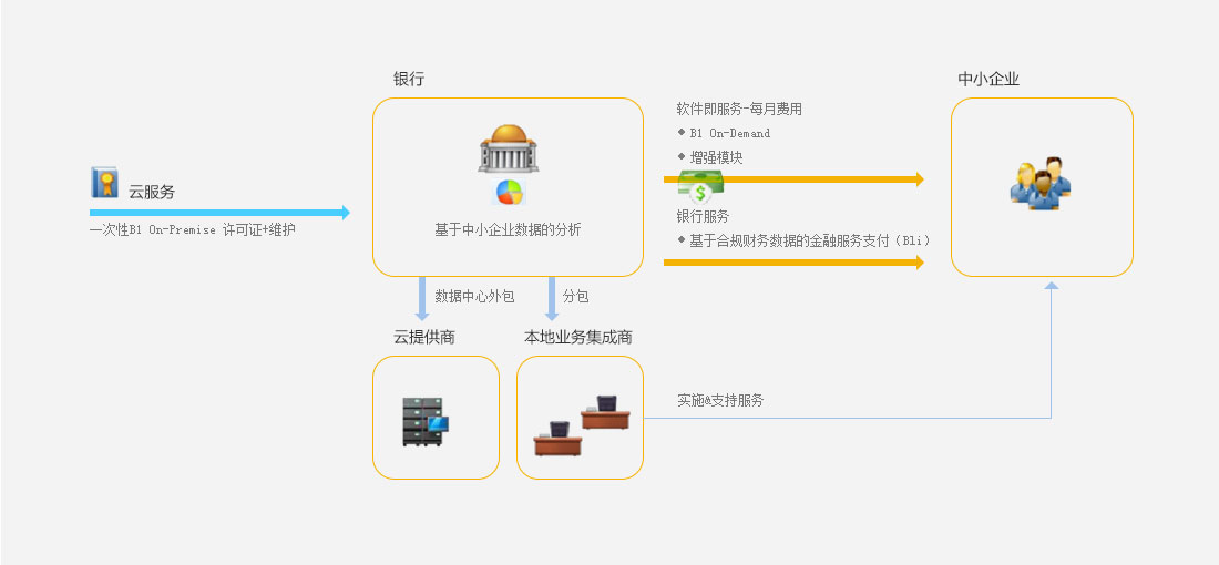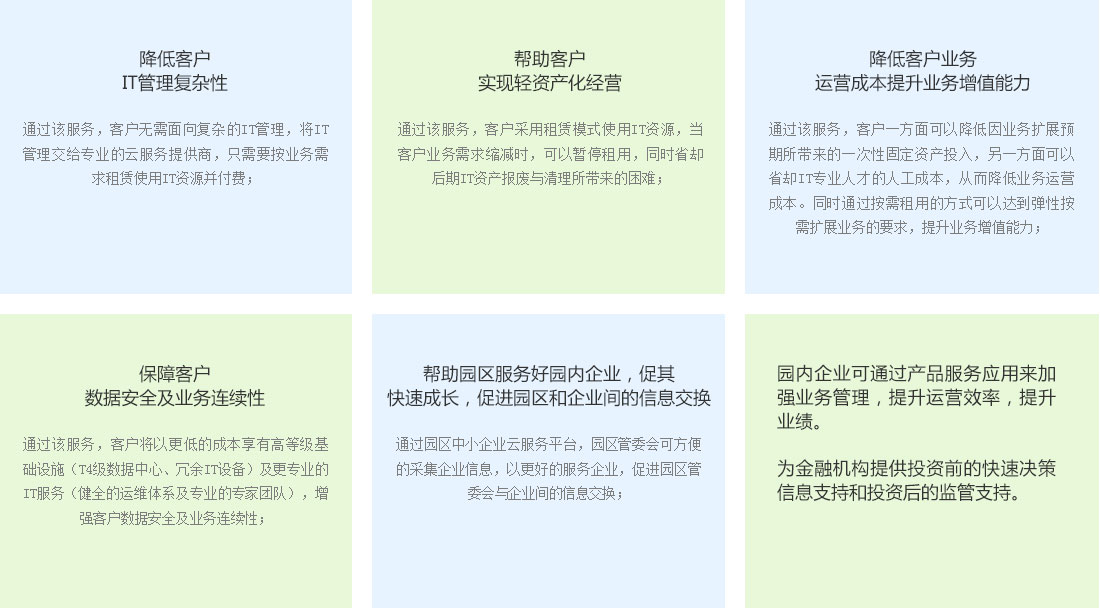 為園區(qū)內企業(yè)提供場地、IT運維、云托管咨詢、B1(或高端ERP私有云)及數(shù)據(jù)挖等按需租賃、按用量付費的云服務,幫助企業(yè)實現(xiàn)財務、人力、物料等內部資源的高效、專業(yè)化管理,并支持產業(yè)園區(qū)基于應用運營所產生的數(shù)據(jù)開展融資貸款、管理咨詢等專業(yè)服務。