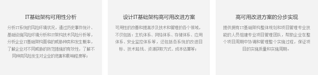 當(dāng)前,信息技術(shù)已經(jīng)深入到各行各業(yè),隨著IT技術(shù)的高速發(fā)展,IT與業(yè)務(wù)的聯(lián)系越來越緊密。IT系統(tǒng)的宕機(jī)將造成企業(yè)巨大的業(yè)務(wù)損失,以及企業(yè)聲譽(yù)下降、競爭優(yōu)勢喪失。近年來發(fā)生的多起IT基礎(chǔ)設(shè)施故障而導(dǎo)致的宕機(jī)事件,生動(dòng)的告誡我們提高IT基礎(chǔ)架構(gòu)可用性的重要性。那么如何發(fā)現(xiàn)IT基礎(chǔ)架構(gòu)存在的風(fēng)險(xiǎn)并及時(shí)解決呢?中金數(shù)據(jù)從以下三個(gè)方面幫助企業(yè)盡可能提高IT基礎(chǔ)架構(gòu)的可用性。