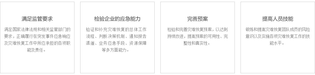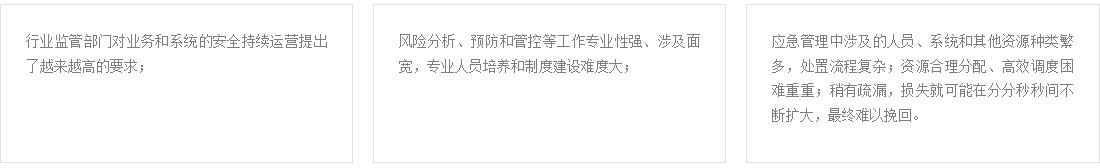 中金數(shù)據(jù)系統(tǒng)業(yè)務連續(xù)性服務能夠全面滿足客戶從數(shù)據(jù)中心基礎設施、IT技術架構到行業(yè)應用等多層面的業(yè)務連續(xù)性需求,自主研發(fā)的業(yè)務連續(xù)性管理Ce-BCP產(chǎn)品覆蓋了風險分析、業(yè)務影響分析、預案開發(fā)、演練管理和維護等專業(yè)領域。借助中金數(shù)據(jù)系統(tǒng)業(yè)務連續(xù)性解決方案,客戶能高效制定業(yè)務連續(xù)性策略與規(guī)劃,建立完善的業(yè)務連續(xù)性管理制度和預案體系,加強演練和日常管理,獲得業(yè)務連續(xù)性管理工作的實效?,F(xiàn)代社會中,各類企業(yè)在持續(xù)運作和安全生產(chǎn)方面面臨著重大的挑戰(zhàn):